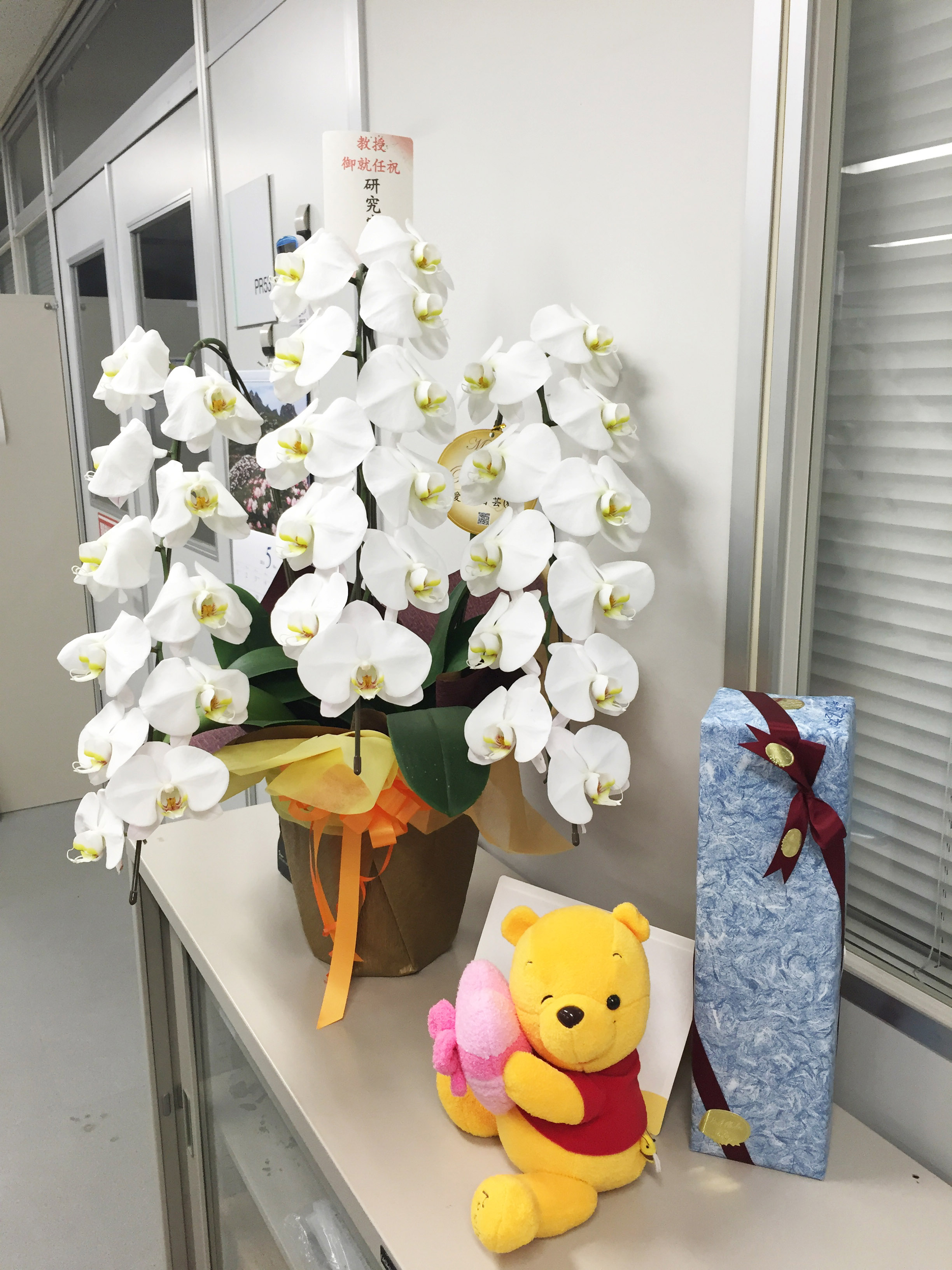 研究室のメンバー、そして修了生の方からお祝いをいただきました。ありがとうございました。新しい研究室の入り口に飾っています - 2016/4/28