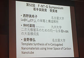 フラーレン・ナノチューブ・グラフェン総合シンポジウムでメンバーのAji君とHyungoo君が発表しました。卒業生の仲村渠君の若手奨励賞の授賞式もありました。