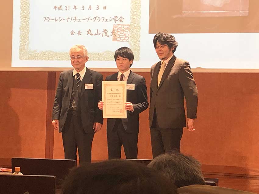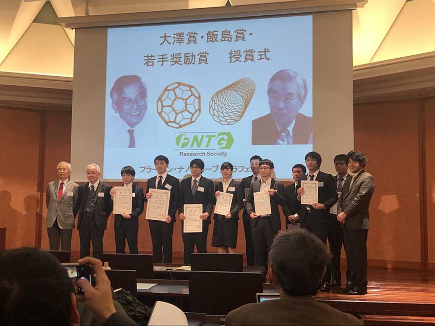 フラーレンナノチューブグラフェン総合シンポジウムで内田君の大澤奨励賞の授賞式がありました。おめでとう。写真はこちら。 - 2019/2/19